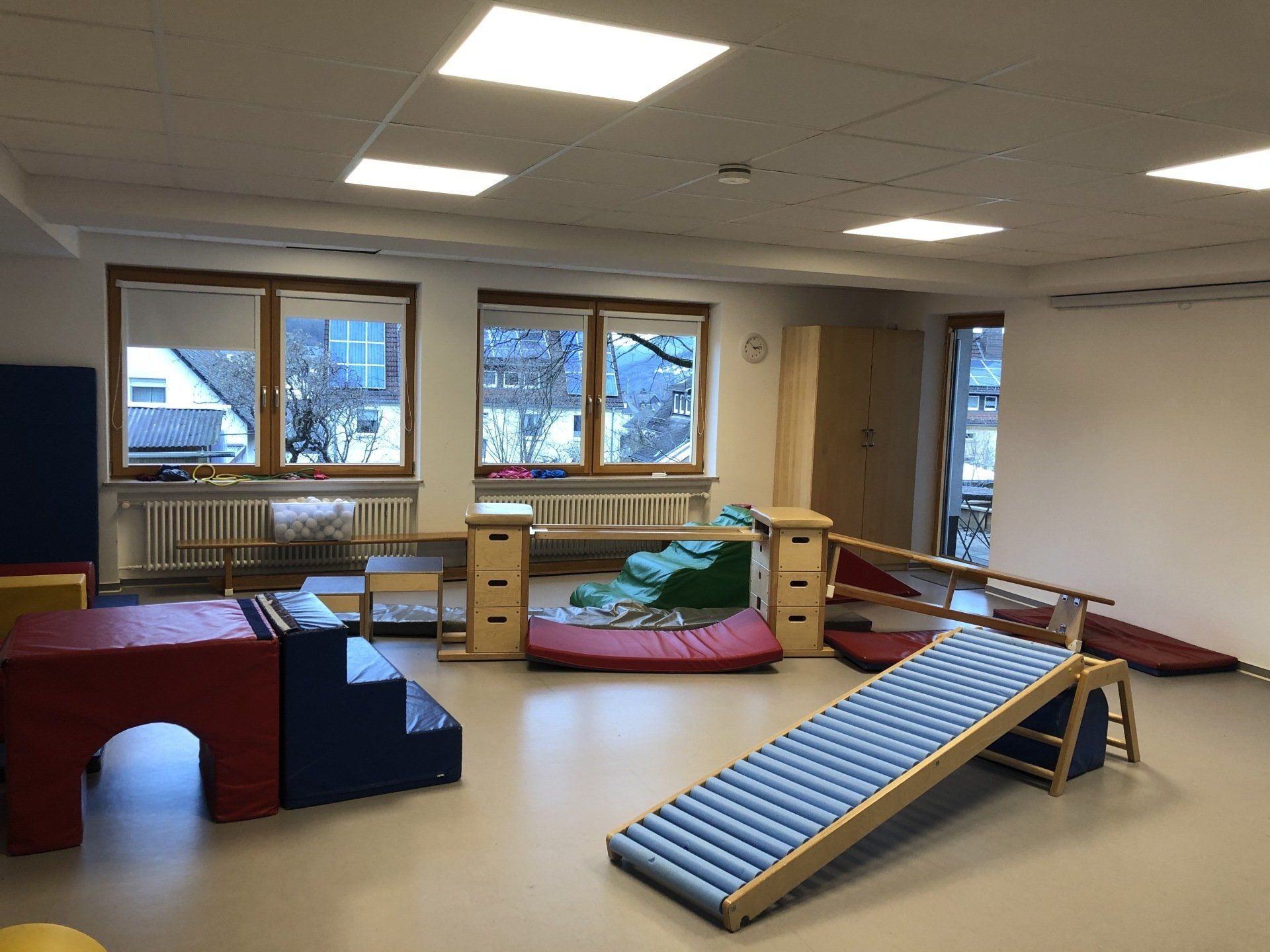 Neben angeleiteten Turnstunden können sich die Kinder während des Freispiels auch hier aufhalten. Dafür stehen ihnen Motorikelemente und Matten zur freien Verfügung.
